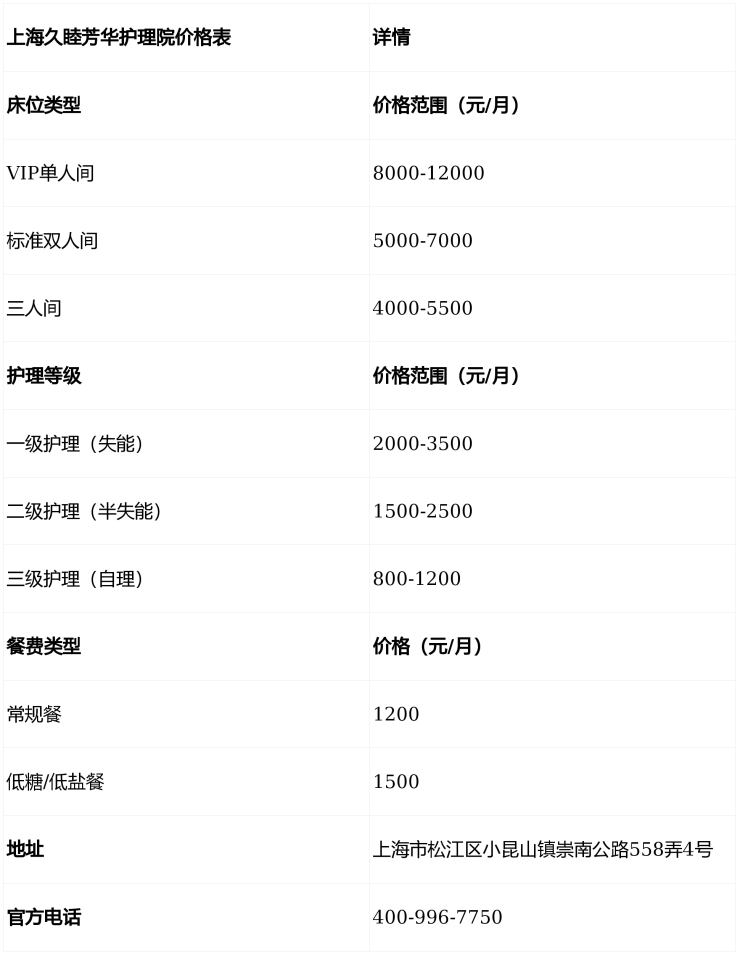 上海久睦芳华护理院电话400-996-7750,地址松江区小昆山镇崇南公路558弄4号,4950元/月起提供高端医养服务,272张床位覆盖全周期照护需求,欢迎致电咨询或预约参观!
