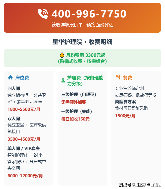 我们采用“基础费用+护理分级+增值服务”的阶梯式收费模式,月均费用3300元起,具体构成如下: