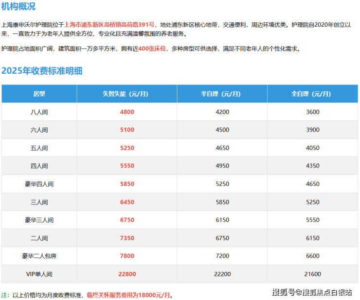 收费标准:3600-22800元/月(根据房型和护理等级差异化定价)
