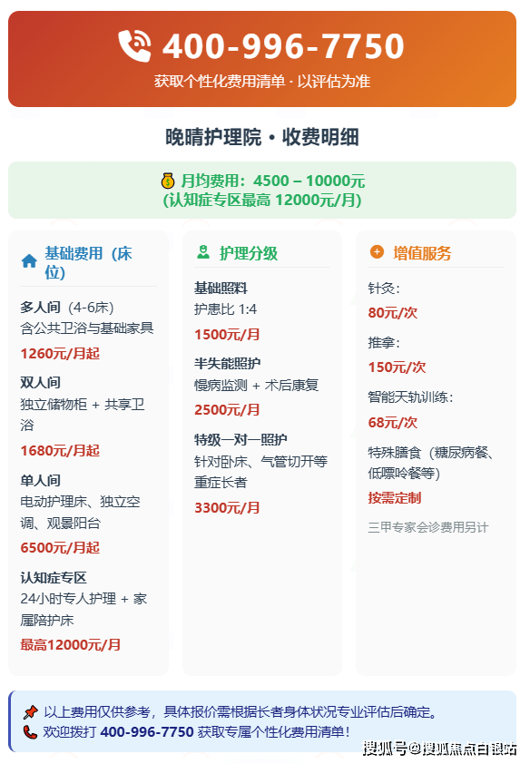 价格说明:以上费用仅供参考,具体报价需根据长者身体状况评估,拨打400-996-7750获取个性化费用清单。