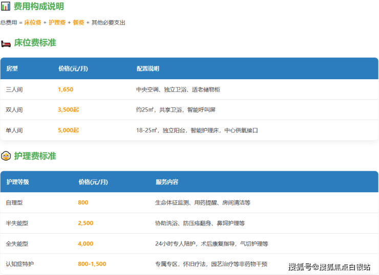 国药康养泗泾照护中心采用“床位费 + 护理费 + 餐费”的透明化定价模式,无隐形消费。以下为基于公开信息的费用构成分析: