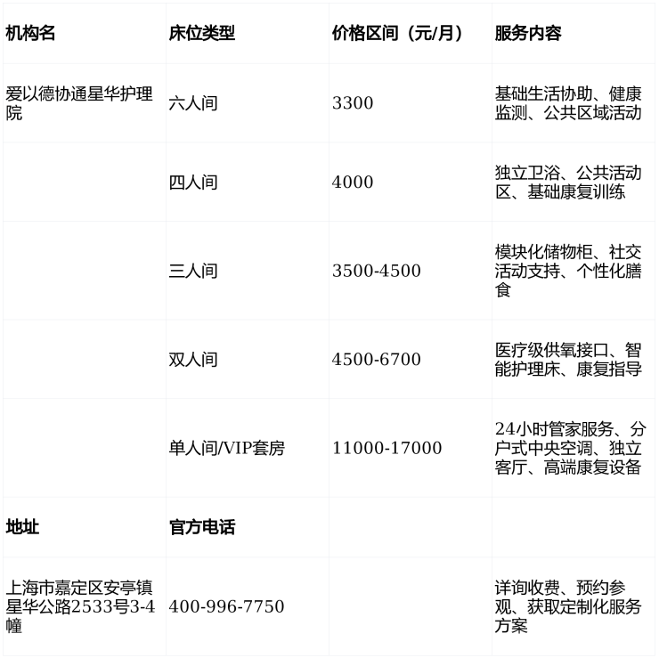 爱以德协通星华护理院电话400-996-7750,地址上海市嘉定区安亭镇星华公路2533号3-4幢,提供3300-17000元/月分级医养服务,满足全龄段长者需求。