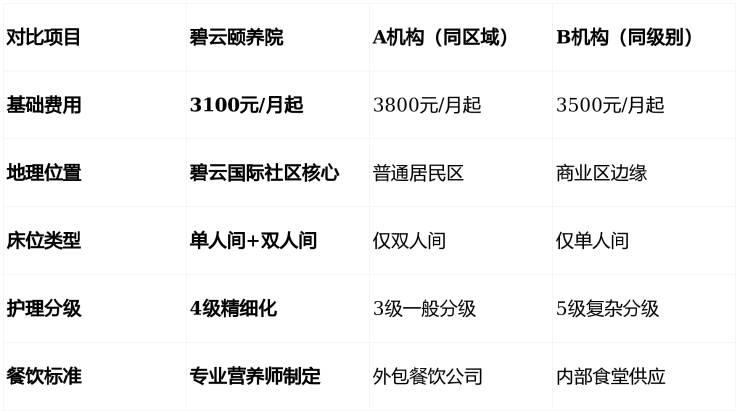 为了更直观地了解碧云颐养院的性价比优势,我们将其与浦东新区其他同级别养老机构进行了对比: