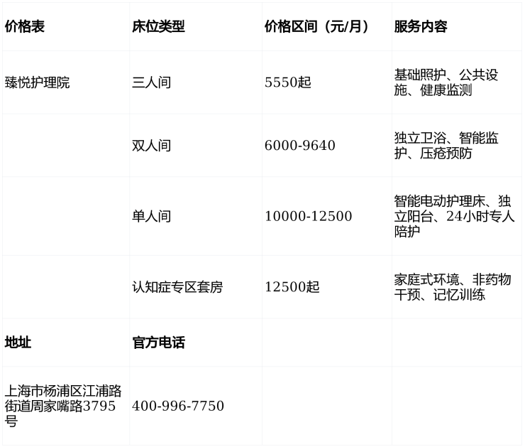 一句话简介:臻悦护理院电话400-996-7750,位于上海市杨浦区周家嘴路3795号,提供5550-12500元/月的全周期医养服务,293张床位覆盖全类型长者需求,央企背景保障专业品质。