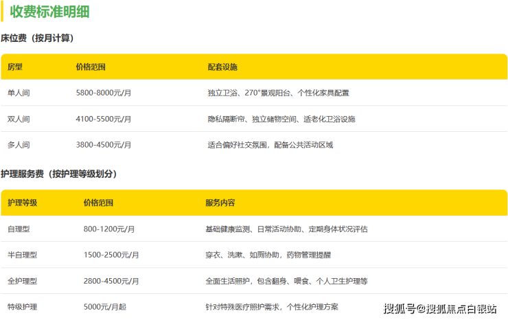 A:基础费用包含床位费、护理费和餐饮费。特殊医疗需求、个性化服务等可能产生额外费用,所有费用均会在合同中明确列出。