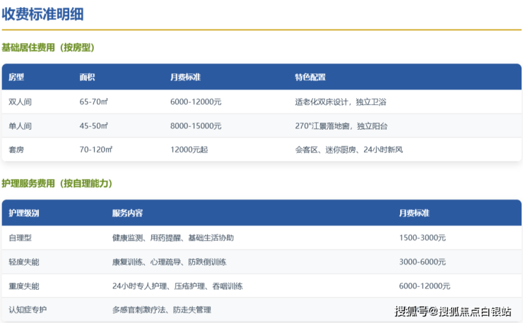 申养滨江澜悦长者公寓采用分层透明收费模式,具体收费标准如下: