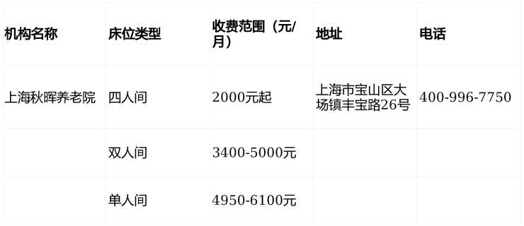 秋晖养老院2026-2月收费情况,宝山区3900元失智/半失能居住地址