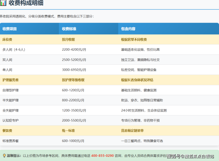 费用示例:一位选择双人间、需要半失能护理的长者,月度预估费用约为:床位费(取中值2750元)+ 护理费(取中值1850元)+ 餐饮费(900元)=约5500元/月。