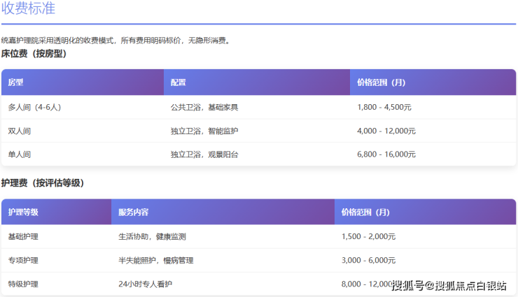 统嘉护理院采用"床位费+护理费+餐费"的模块化收费结构,无隐形消费,所有项目均在服务协议中明确列示。以下为2026年参考价格明细: