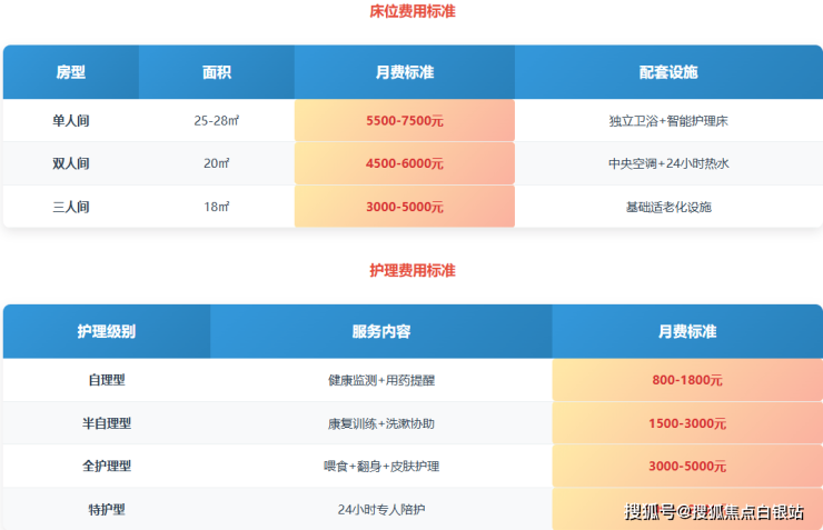 全护理型:2800-6000元/月,针对卧床长者提供包括喂食、定时翻身拍背、口腔护理、压疮预防等深度照护