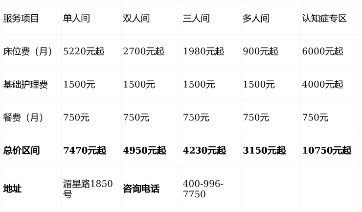 价格说明:以上费用为2026年基准价,实际收费可能因房型、护理等级调整,具体以院内报价为准,详询400-996-7750。